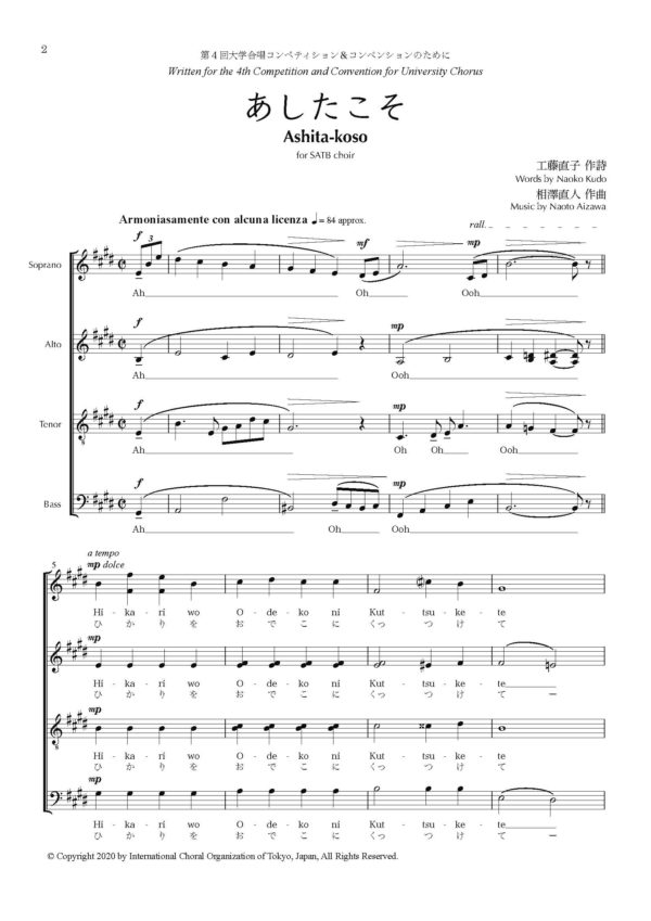 この作品は、第4回大学合唱コンペティションの課題曲として作曲しました。このコンペティションは、書き下ろしの課題曲が出演団体に配布されるのが本番の1ヶ月前であることが特徴で、限られた期間で、大学生が知恵を絞って音楽作りをします。そこで、詩は意味においては平易で、しかし内容は奥深く、発語して美しい響きと思えるものを選択しました。楽曲はなるべくシンプルなリズムで、ゆったりと、縦のハーモニーを味わいながら、子音と母音の調和を楽しめる作品に、と願いました。多く使用している付加音のバランスや彩り、音階固有和音から離れる瞬間の期待感、冒険心、憧憬などを感じ、伝えてくださると、皆で幸福を共有できると考えています。