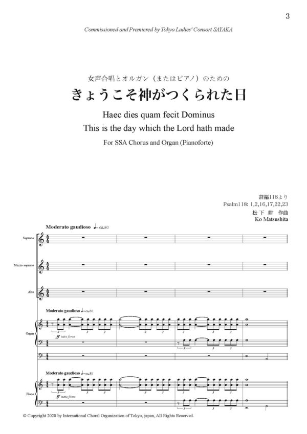東京レディースコンソート“さやか”のイタリア演奏旅行のために、混声版から編曲したものです。初演は、2010年6月12日、ミラノのサンタンブロージョ教会で行われ、神に捧げられました。混声版と同様、この曲はオルガンの伴奏をともなっていますが、ピアノでも演奏可能です。ピアノ譜も付いていますから、オルガンで演奏できない場合はピアノとともに演奏なさってください。ピアノパートは、ピアノの特性を生かした独自の作りになっています。