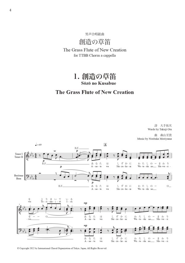 作曲者: 森山至貴 作詩者:大手拓次 声部: TTBB 伴奏: アカペラ 言語: 日本語 演奏時間: 15’00” ページ数: 28