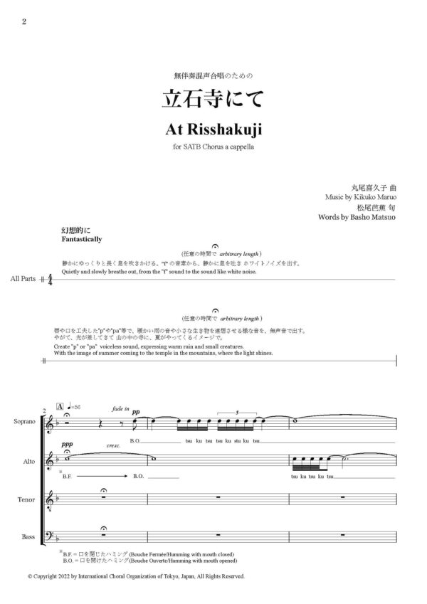 この作品は「のるでぃーこあんさんぶる」の委嘱により作曲し、2015年に三井住友しらかわホールで開催された「第22回愛知県ヴォーカル・アンサンブルコンテスト」で初演されました。松尾芭蕉の俳句「閑さや 岩にしみ入る 蝉の声」をテキストにして透明で柔らかな優しい『音空間』を創りたいと思いました。この度の出版では、初演時には無かった冒頭の文字で書かれた2段を加筆しています。この部分は、合唱団の皆さんが色々と工夫して楽しんでやってもらえれば嬉しいです。しんしんと雪が降る山寺、芽吹きの時がやってきて生き物がごそごそ嬉しそうに動き出す春、柔らかい雨が降りやがて夏になり蝉が鳴く。いつまでもそんな地球でありますようにと願います。