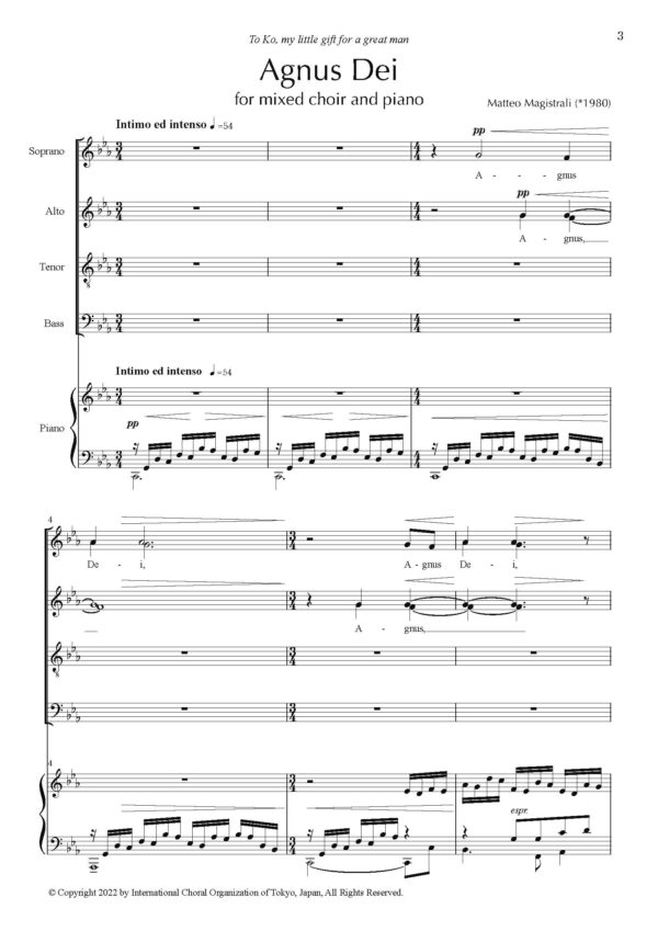 私の考えでは、Agnus Dei のテキストには、国籍、性別、年齢を問わず、人間が生きる上でのあらゆる苦しみや困難が含まれていると思います。 冒頭部では、休みなく続くピアノパートと合唱が発する厳しい音により、人間が時として直面しなければならない痛みを表現しています。しかしそれは、光と響きによって、喜びと平和の確信へと流れていきます。平和、喜び、平穏という目標を常に追い求めることは、私にとって、信仰を超えたすべての人間に対する最大かつ最も素晴らしい希望のメッセージです。 この作品では 4 つのテーマが絡み合っています。 人の贖い主である神の子への信仰、神が約束した平和の国への希望、子羊として人類のために自らを犠牲にし、自らの命という究極の贈り物をした神の愛、日本の歌から取った 2 つの音楽の断片を曲中に入れることで表現した友情です。最初に現れる断片は、曲の進行に伴って、徐々に曲の流れと絡み合いながら成長します。人生と同様に、過ぎ去った時間が誠実な友情を結び固めるのです。