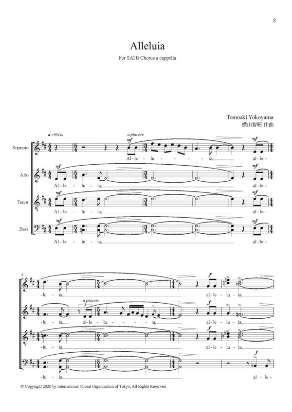 In this piece, I express the prayer, dynamism, and enthusiasm I felt in the words “Alleluia”. The introductory part is homophonic, and the solo parts following that appear in order of soprano ⇀ alto ⇀ bass, each singing a form of prayer or praise.