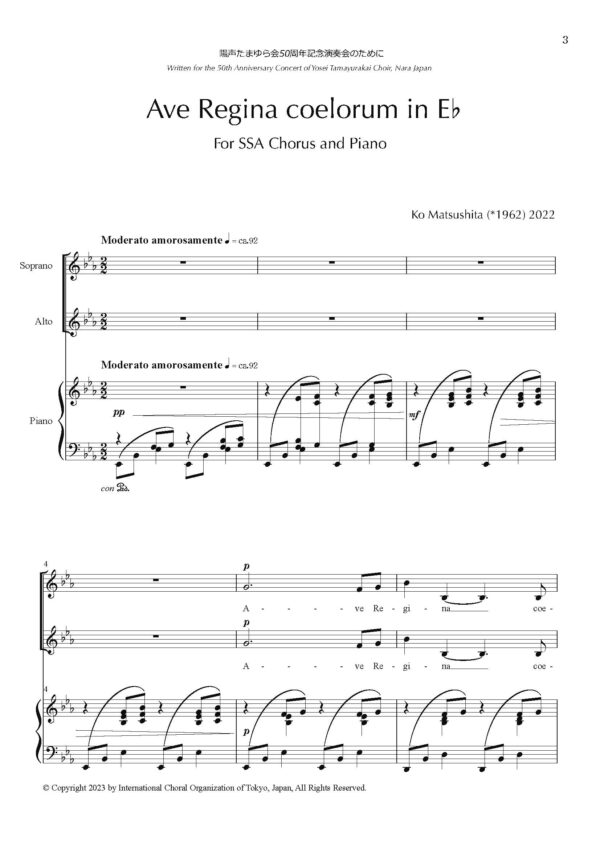 この曲で私は、シニア世代や合唱の初心者にも無理なく演奏していただけるように、平易で美しい旋律を書こうとした。 豊かな神の恵みに満ちた水(これは感情の象徴である)が湧き出ずるようなピアノの前奏に導かれて歌われる旋律は、アラベスクの音化である。ゆったりとした動きの中に、ダイナミックな高低差を置いた。 転調や拍子の変更による色彩の変化を伴いながら、あくまでもしなやかに曲は進んでゆく。聖母マリアの愛を穏やかに、優しく表現していただきたい。