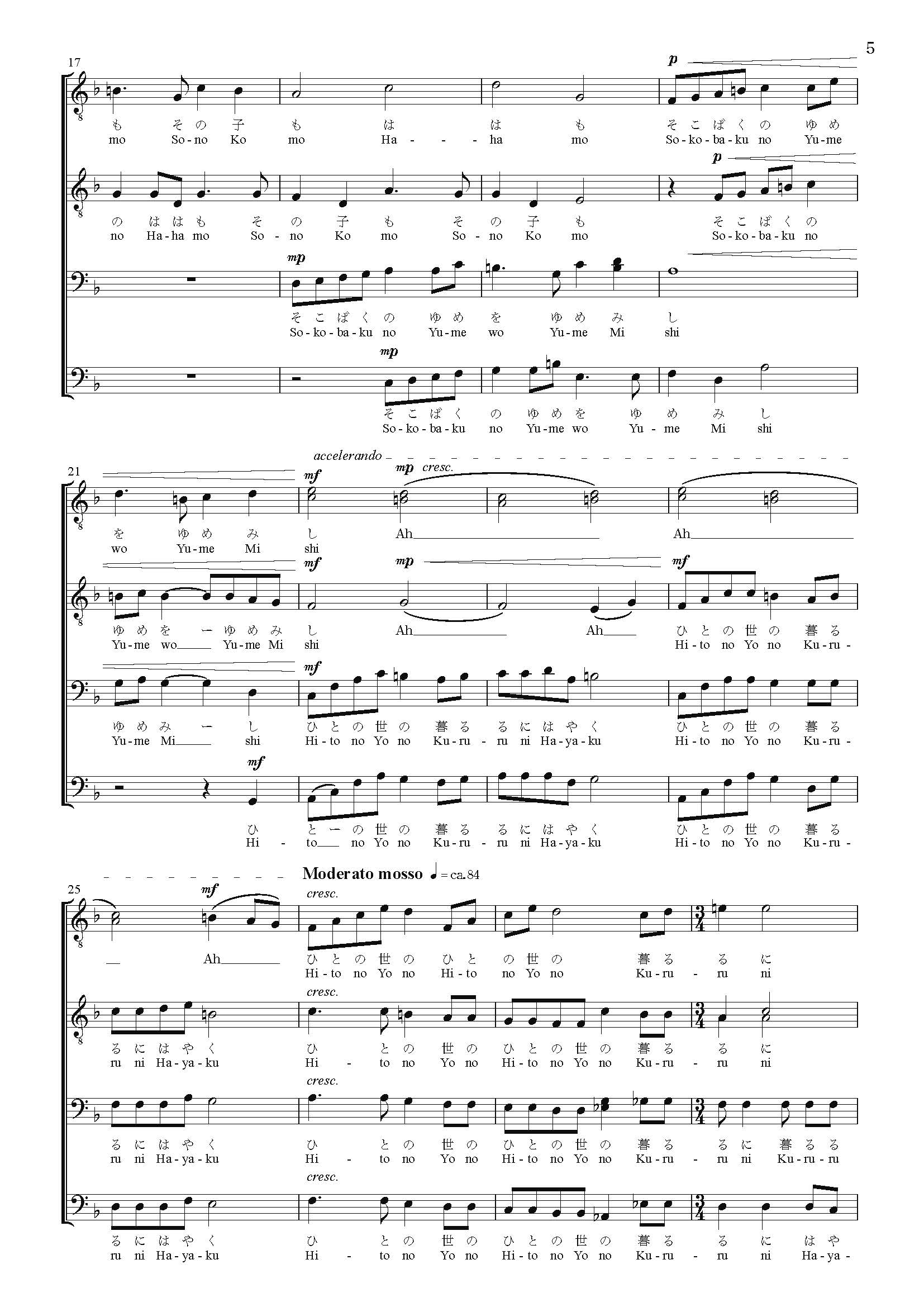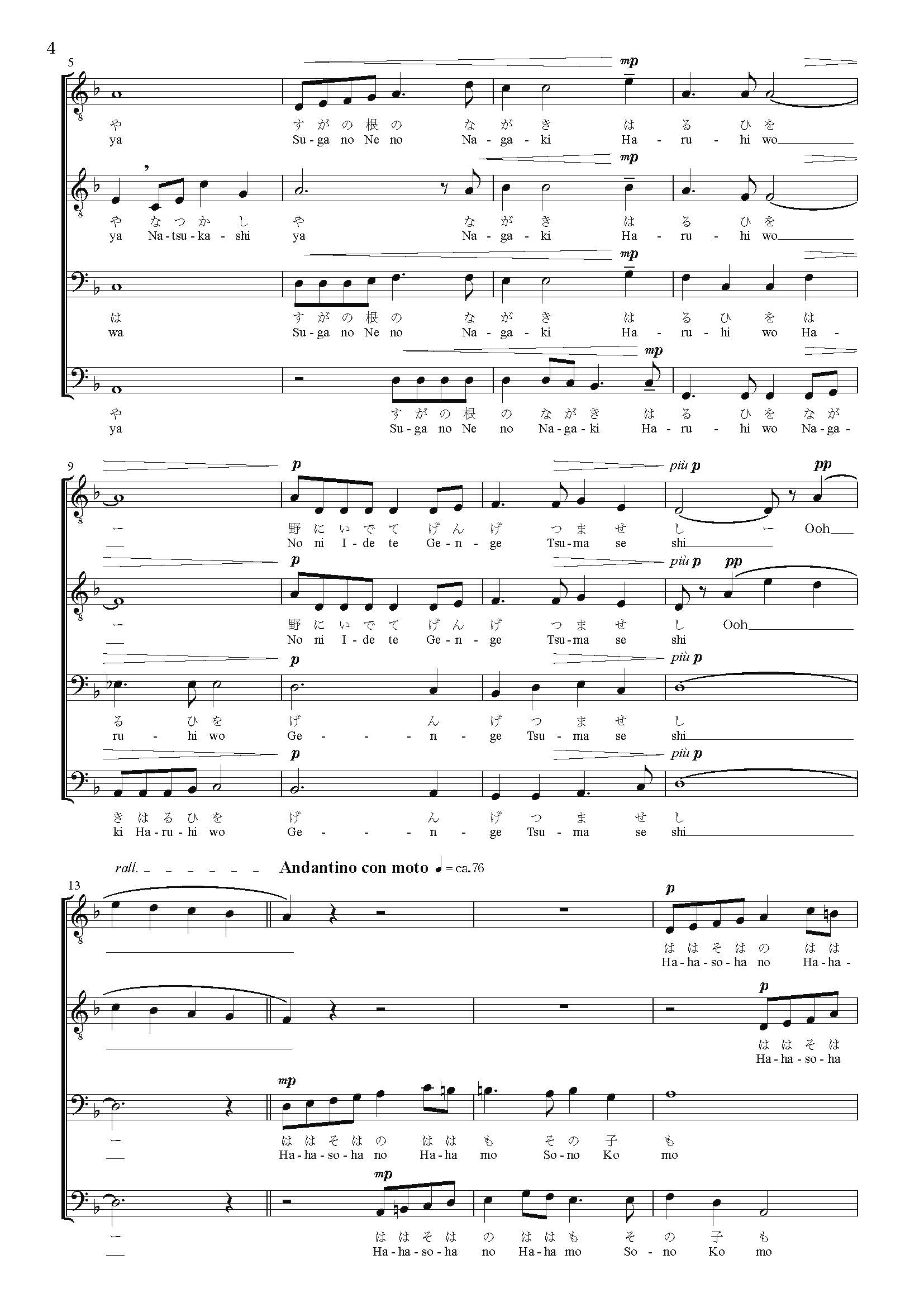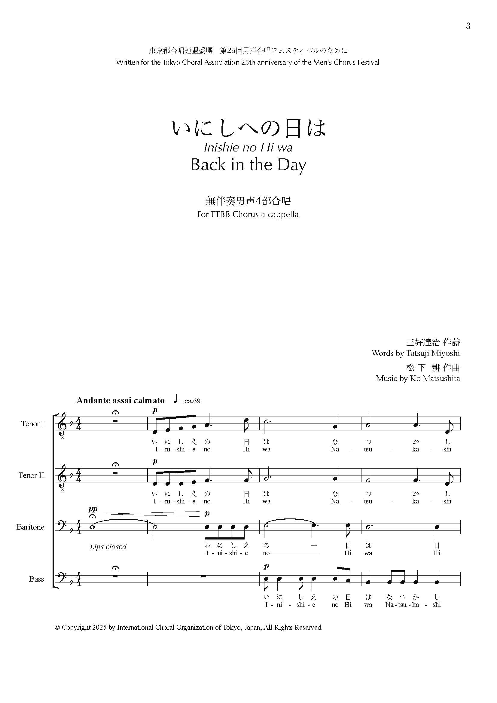 誰でも簡単に歌える、平易な書法によっているから、是非多くの男声合唱団に楽しんでいただきたいと思っている。