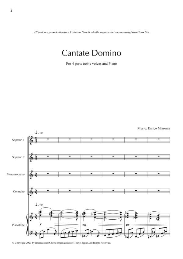 Cantate Domino was composed in the spring 2019 after a commission from Eos female choir of Rome, conducted by M° Fabrizio Barchi. The work had a particularly complex genesis due to the close connection with the commissioning choir. Their conductor asked me to modify numerous formal and musical aspects of the piece. This stimulated me a lot to try to be myself but at the same time meet the needs of the choir to create an interesting piece both for the composer and the choir.
