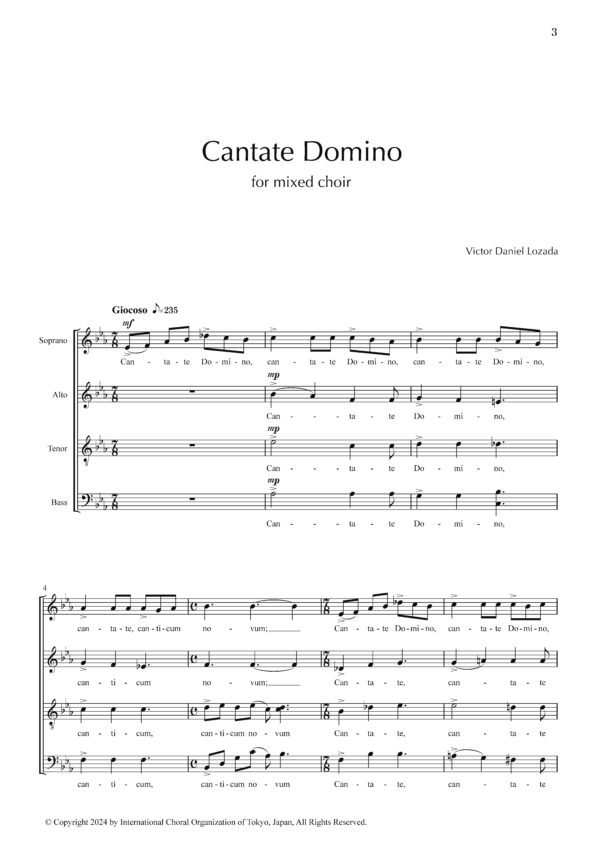 It is a choral work based on Psalm 95 of the Vulgate Bible. It is an exaltation in honor of God for the wonders he has created. This work contains jubilant rhythms with mixtures of measures representing contemporaneity. The mystical moments are reflected in the subtlety of the melodies with tonal changes that evoke the mystery of the greatness of the omnipotent.