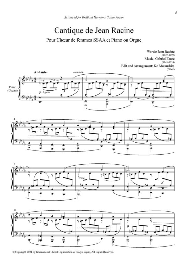Gabriel Fauré’s “Cantique de Jean Racine” Op. 11, is an early masterpiece, written as his graduation work at the Conservatory in 1865. Based on a poem (original in Latin) by Jean Racine (1639-1699), a French classical playwright, it is a reverent prayer to God.