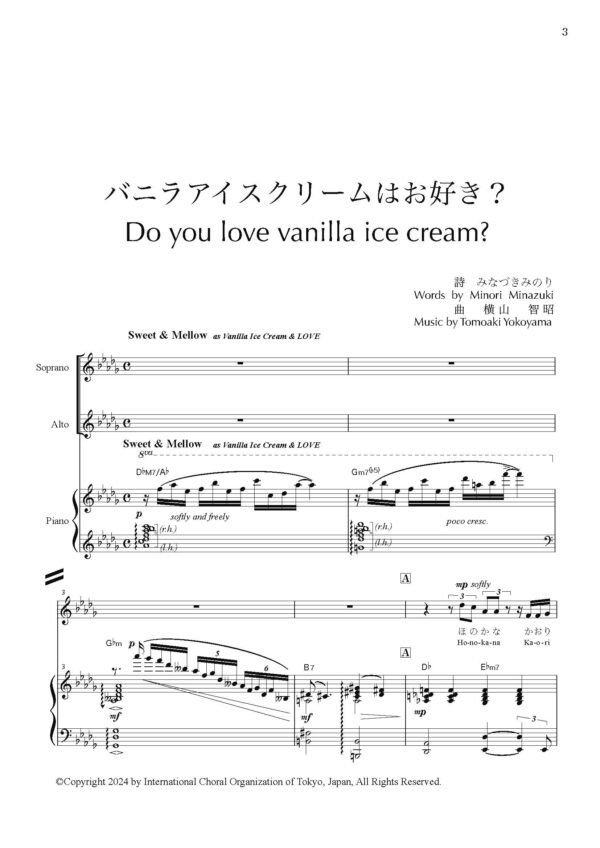 作曲者:横山智昭 作詩者:みなづきみのり 声部:SA 伴奏:ピアノ 言語:日本語 演奏時間:4’10” ページ数:12
