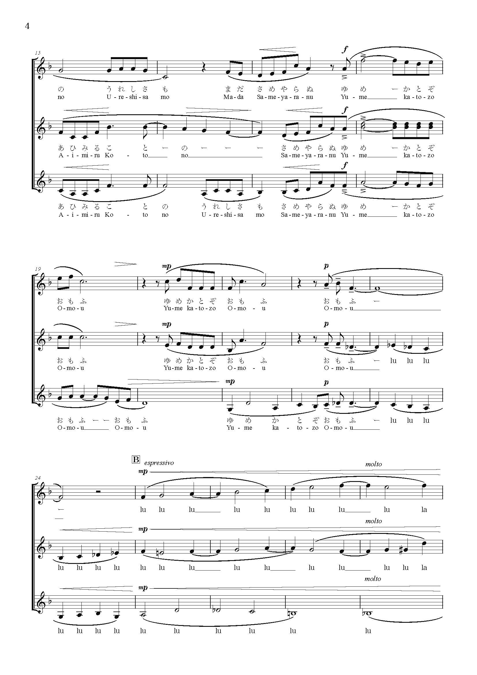 These are somonka — love poems exchanged between two people — that have transcended time and endured to this day. This choral work was crafted to paint the graceful and beautiful world of Japanese waka poetry as if drawing with a brush in ink. The first section soars with the disciple’s (Teishinni’s) longing, reverence, and welling elation toward her master (Ryokan). A transitional passage (B) serves as a bridge connecting the two, leading through a key change into the latter section (C), where Ryokan’s serene, unattached state of enlightenment is given voice. The work closes not with a simple tonic chord, but with a polytonal sonority — mysterious and ethereal — evoking a sense of touching the profound depths of a realm not easily reached.
