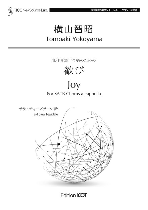サラ・ティーズデールによる詩「Joy」には、どの行からも溢れんばかりの情熱が感じられます。様々なことばに記された愛・風景・宇宙・燃え上がる想いを、メロディやハーモニーやリズムとして楽譜に表しました。前半(12小節目まで)では横の流れを大事にしてエモーショナルな気持ちを表現し、後半(13小節~)は今にも飛び跳ねていきそうな躍動感を的確なリズムで、かつノリ良く歌っていただければと思います。また全体的に、3連符の部分や16分音符の多い部分などの音楽的な切り替えをはっきり表現してください。歌っていただくグループそれぞれの「Joy」を聴かせていただければ作曲者にとってこれほど嬉しいことはありません。