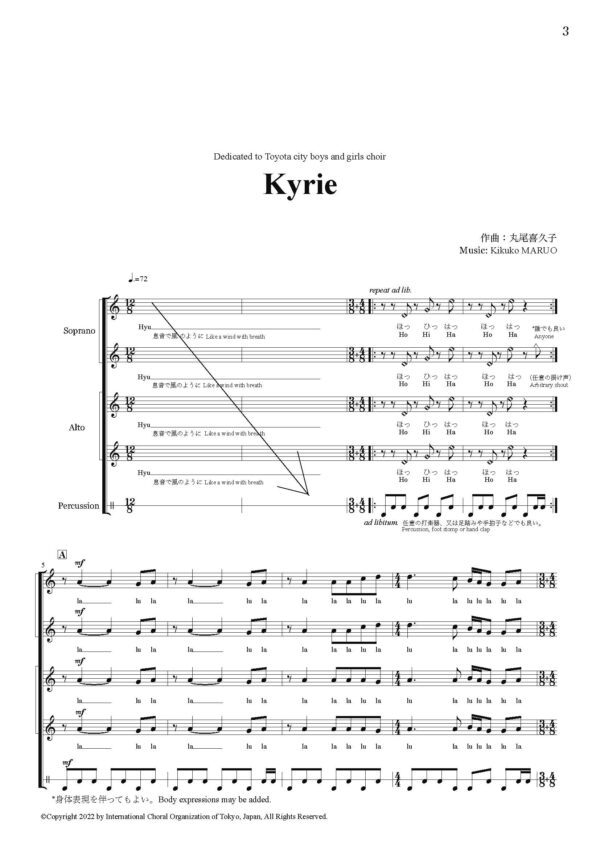 作曲者: 丸尾喜久子 声部: SSAA 伴奏: アカペラ 言語: ラテン語 演奏時間: 3’20” ページ数: 12