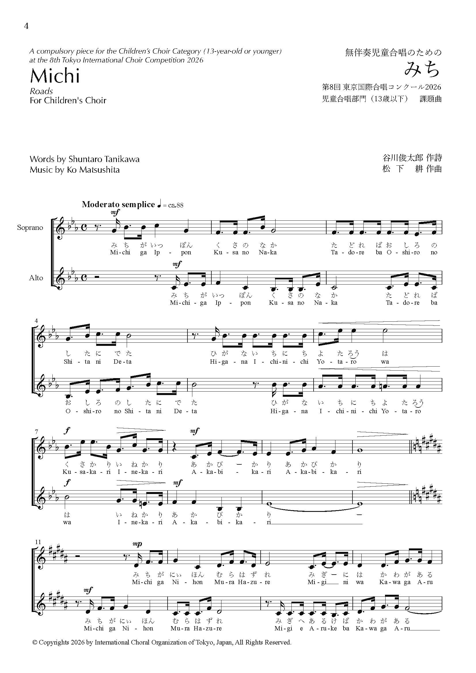 For this A-1, Children’s Choir (age 13 and under) category, I have always composed the set piece myself — all pieces are very simple, a melody that even elementary school children can sing with ease, performed a cappella. This year’s set piece, Michi, is no exception: a straightforward two-part a cappella choral work built on a major pentatonic scale using only the five notes d-r-m-s-l. The tonality shifts through E♭ major, B major, and E major. At first glance, these modulations may appear challenging, but when practiced using movable do solfège, the modulations flow entirely without stress, allowing singers to express the key changes with beauty and naturalness.