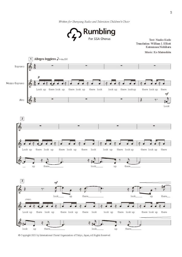 作曲者: 松下耕 作詩者: 工藤直子/ 訳ウィリアム I エリオット、西原克政 声部: SSA 伴奏: アカペラ 言語: 英語 演奏時間: 4’00” ページ数: 16