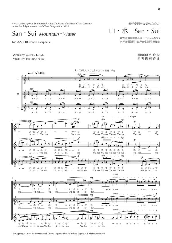 作曲者:新実 徳英 作詩者:種田 山頭火 声部:SSA/TTB 伴奏:アカペラ 言語:日本語 演奏時間:2’30” ページ数:8