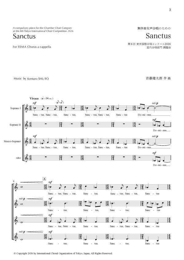 作曲者: 首藤健太郎 声部: SSAA 伴奏: アカペラ 言語: ラテン語 演奏時間:2’20” ページ数: 12