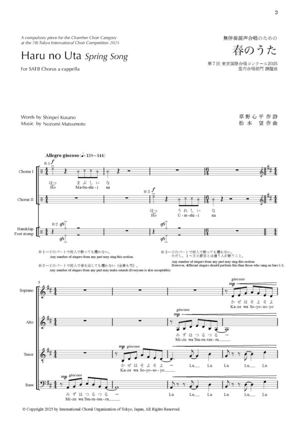 長い冬眠を終えて外に出てきた蛙が全身で喜びを感じる詩。この詩を形作っている言葉の楽しいリズムを活かすような曲作りを心がけました。基本的にはリズミックで快活な曲調の部分が多いですが、途中に出てくる数少ない“歌う”部分で、リズミックな部分との対比を充分に表現してほしいと思います。 この曲にはHandclapとFoot stompが歌のリズムの合いの手として数か所入っており、その部分を何人で、どんなニュアンスで演奏するのかは、大半が演奏者の自由に委ねられています。前後関係からどのような演出をするのか、演奏してくださるそれぞれの団体が想像を広げて、個々のオリジナリティの出る演奏にしていただけたらと思います。