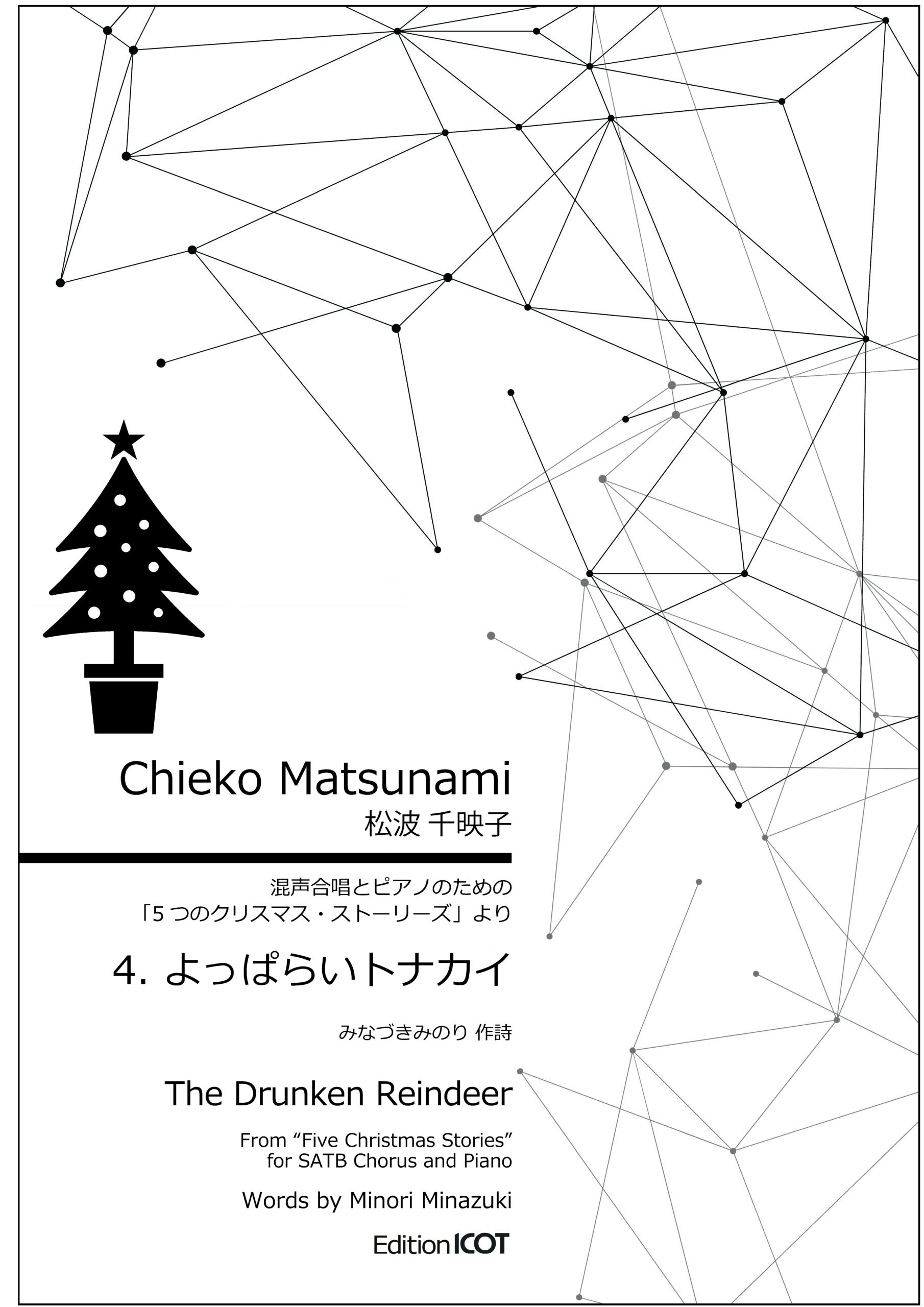 混声合唱とピアノのための 「5つのクリスマス・ストーリーズ」より 4. よっぱらいトナカイ 作曲者:松波千映子 作詩者:みなづきみのり 声部:SATB 伴奏:ピアノ 言語:日本語 演奏時間:4’00” ページ数:20 【参考動画】