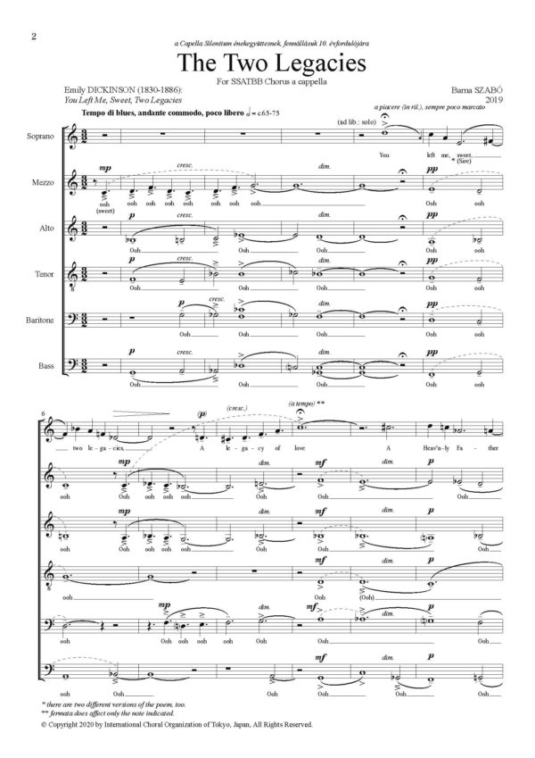 作曲者: Barna Szabó 作詩者: Emily Dickinson 声部: SSATTB 伴奏: アカペラ 言語: 英語 演奏時間: 2′ – 2’30” ページ数: 8
