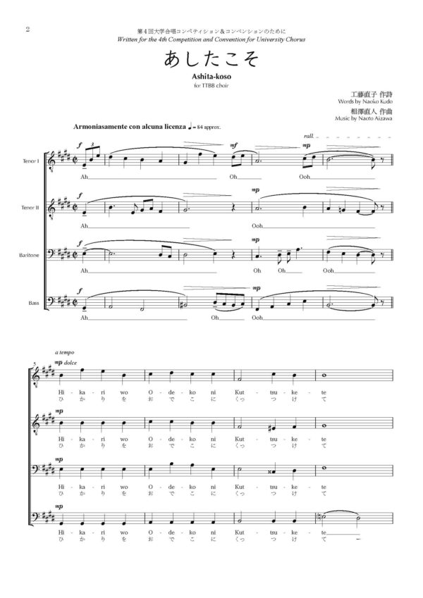 This piece was composed as a set piece for the 4th Competition and Convention for University Chorus. This competition is unique from the sense such that newly composed set piece is announced before the performance at the stage. I chose words whose meaning is easy to understand, but the content is profound, so that its utterance has a beautiful sound. The rhythm is intended to be as simple as possible, and allow the listener to enjoy the harmony of consonants and vowels while savoring vertical harmony. The balance and coloration of the many additional notes used, and the anticipation, sense of adventure, and longing for the moment of separation from the inherent chords of the scale can be felt and communicated to the audience, so that all can share in the happiness of the piece.