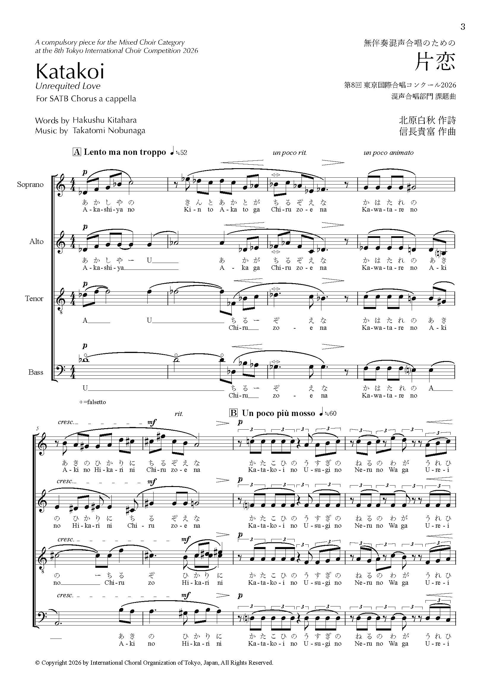 Kitahara Hakushu (1885–1942) is one of the most prominent poets in modern Japan. In addition to poetry, he produced a vast body of work including tanka (short poems) and nursery rhymes (doyo) and folk songs. This piece, “Katakoi” (Unrequited Love), was written in the autumn of 1909 and belongs to Hakushu’s early period. Hakushu himself stated, “This kouta (short song) completely transformed my poetic style,” indicating that the poem was composed with a strong consciousness of musicality. Written entirely in the 5-7-5 syllable structure, it evokes the popular folk songs of that era.