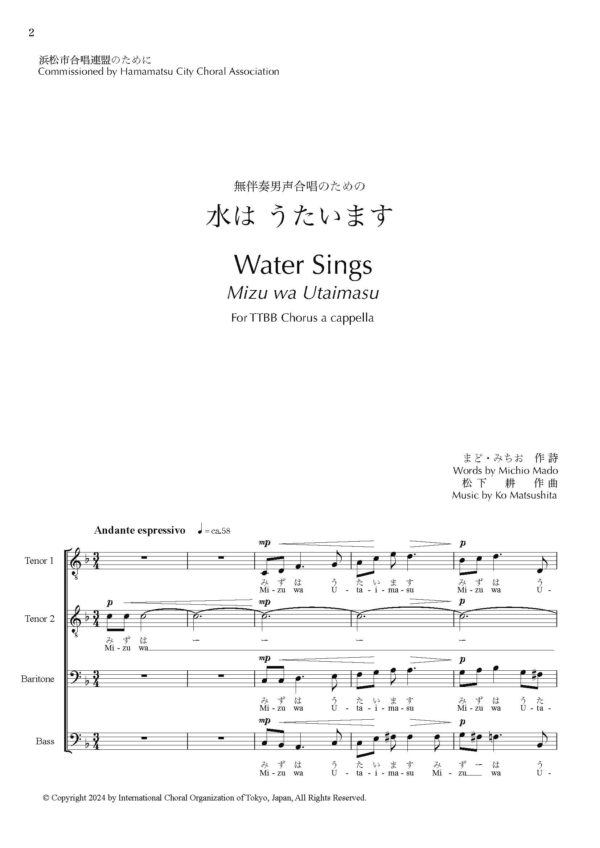 Composer:Ko Matsushita Lyricist:Michio Mado Parts:TTBB Accompaniment:a cappella Language:Japanese Performance Duration: Pages:16